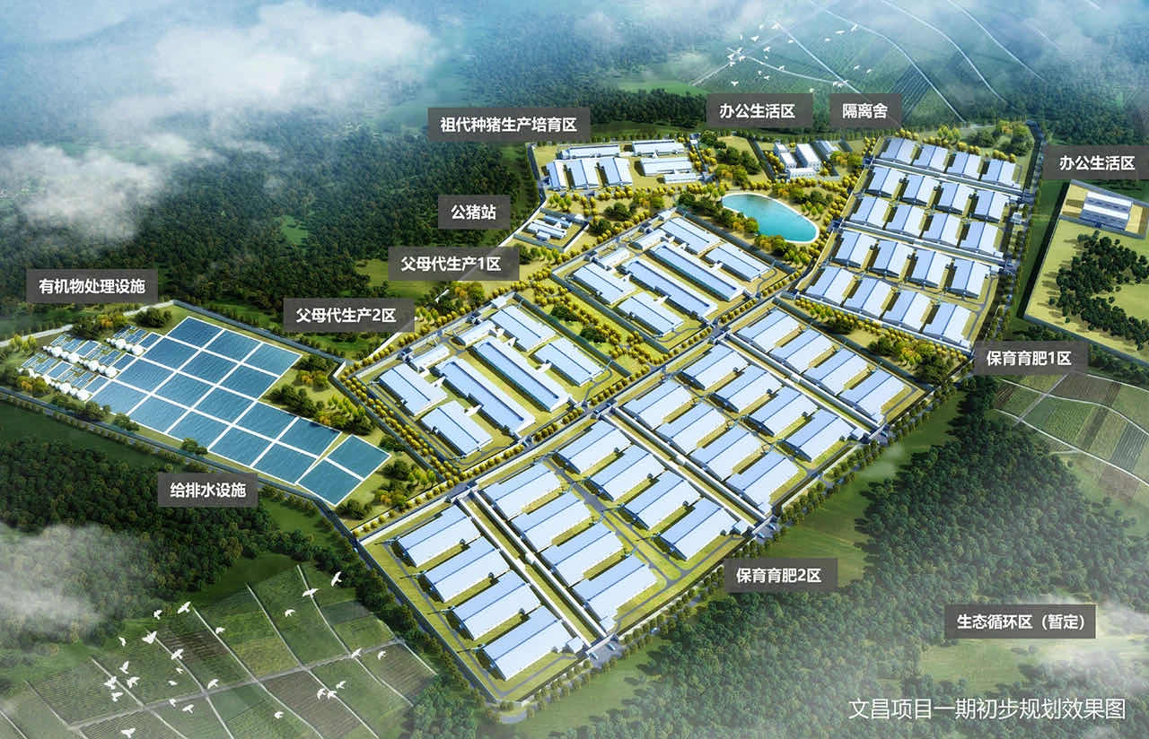 项目位于文昌市昌洒镇,规划建设养殖核心区、饲料生产区、屠宰加工区、食品与冷链区、生态循环区五个功能区,计划投资10亿元,分生猪养殖和产业配套两期开发,采用批次化自繁自养的生产模式。项目一期总占地面积约1412亩,建筑面积约29万平方米,主要建设内容包括:1500头GP祖代种猪生产线1条、6000头PS父母代种猪生产线2条、150头公猪站1座,以及存栏1.2万头的保育育肥猪舍11组,合计年出栏30万头商品猪。